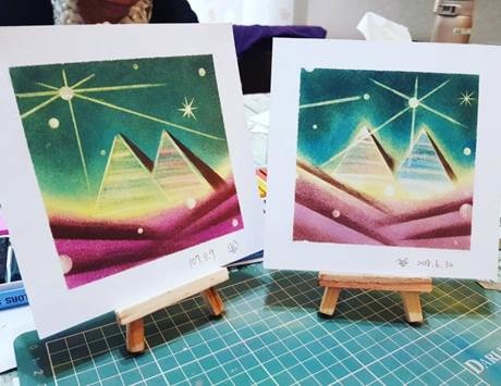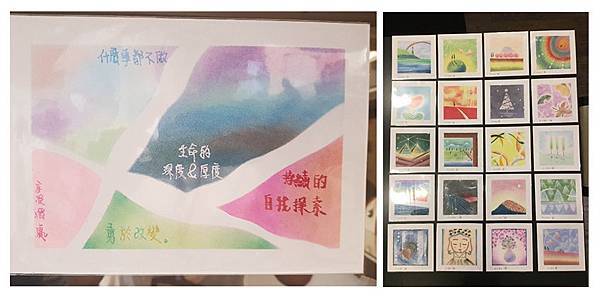 阿姍我看見牆上貼滿了許多相同的作品,一問之下,原來是學員們的成果展現,Micky選擇的就是這樣的方式。在老師陪同完成20幅畫後,再加上自行創作的3張畫,一旦完成這23張後,就可獲得準指導師的資格。有很多人想創業,就來報名師資課程,為自己的未來開創新的人生呢!